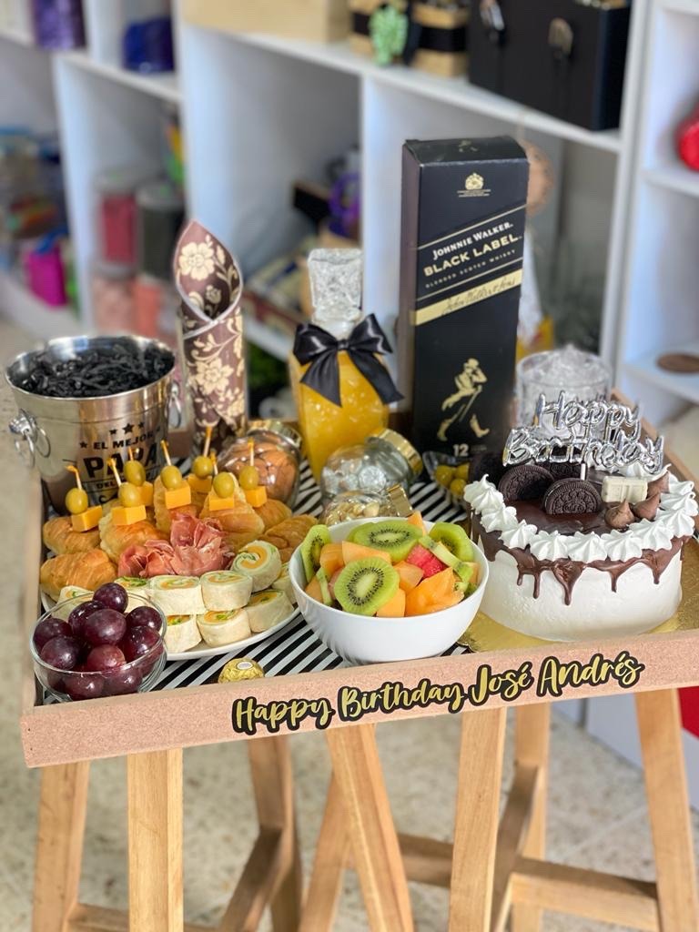 Picadera fría, incluye bizcocho , blanck label, bowl de frutas , hielera , vasos personalizados en vinil, envoltura, dedicatoria y set de globos.