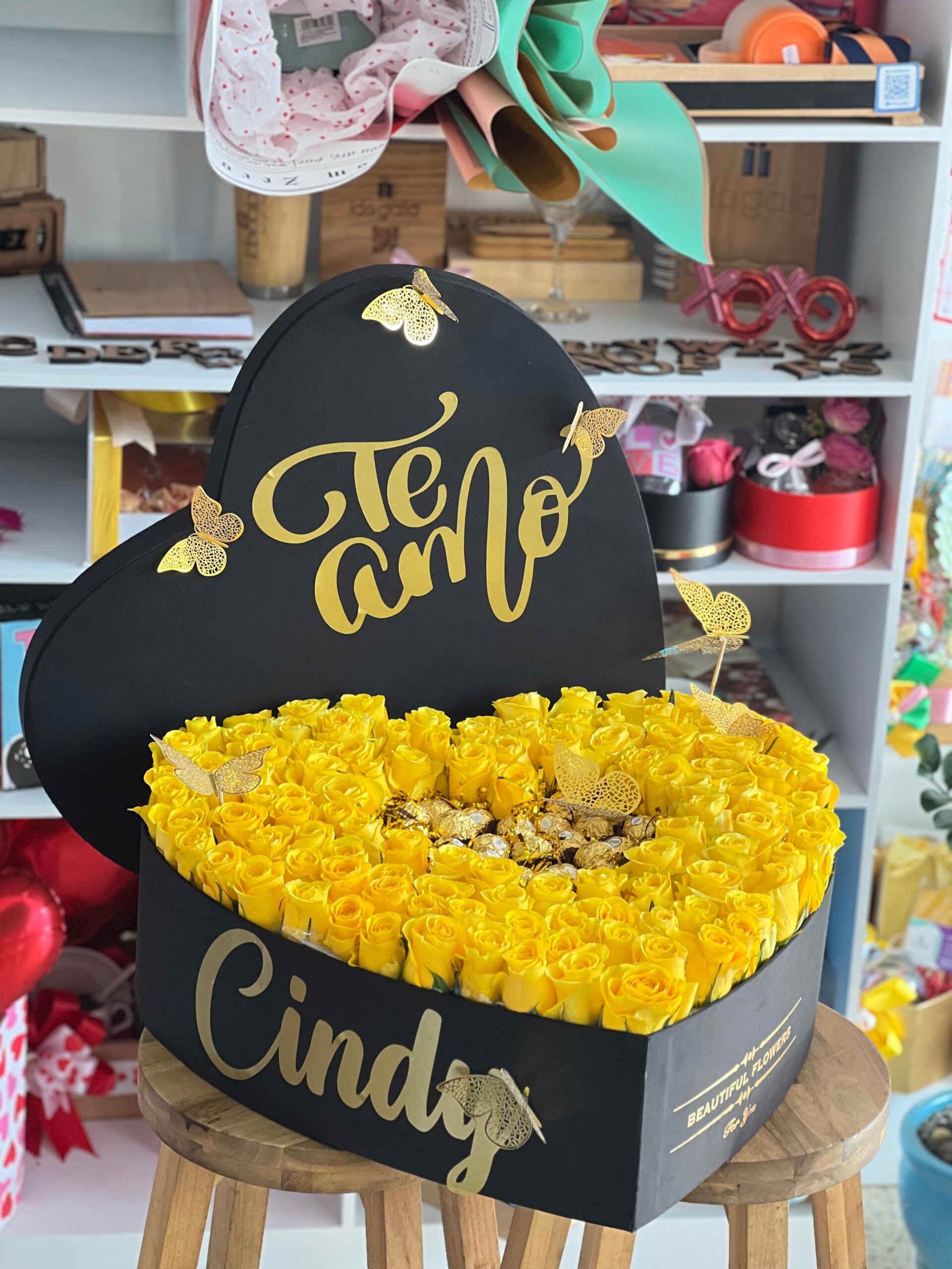 Un delicado cofre que guarda la magia del amor y la alegría: rosas amarillas frescas, símbolo de amistad, cariño y luz, cuidadosamente dispuestas para iluminar su día. Acompañadas por los exquisitos chocolates Ferrero, una dulce invitación a deleitar los sentidos y crear momentos inolvidables.