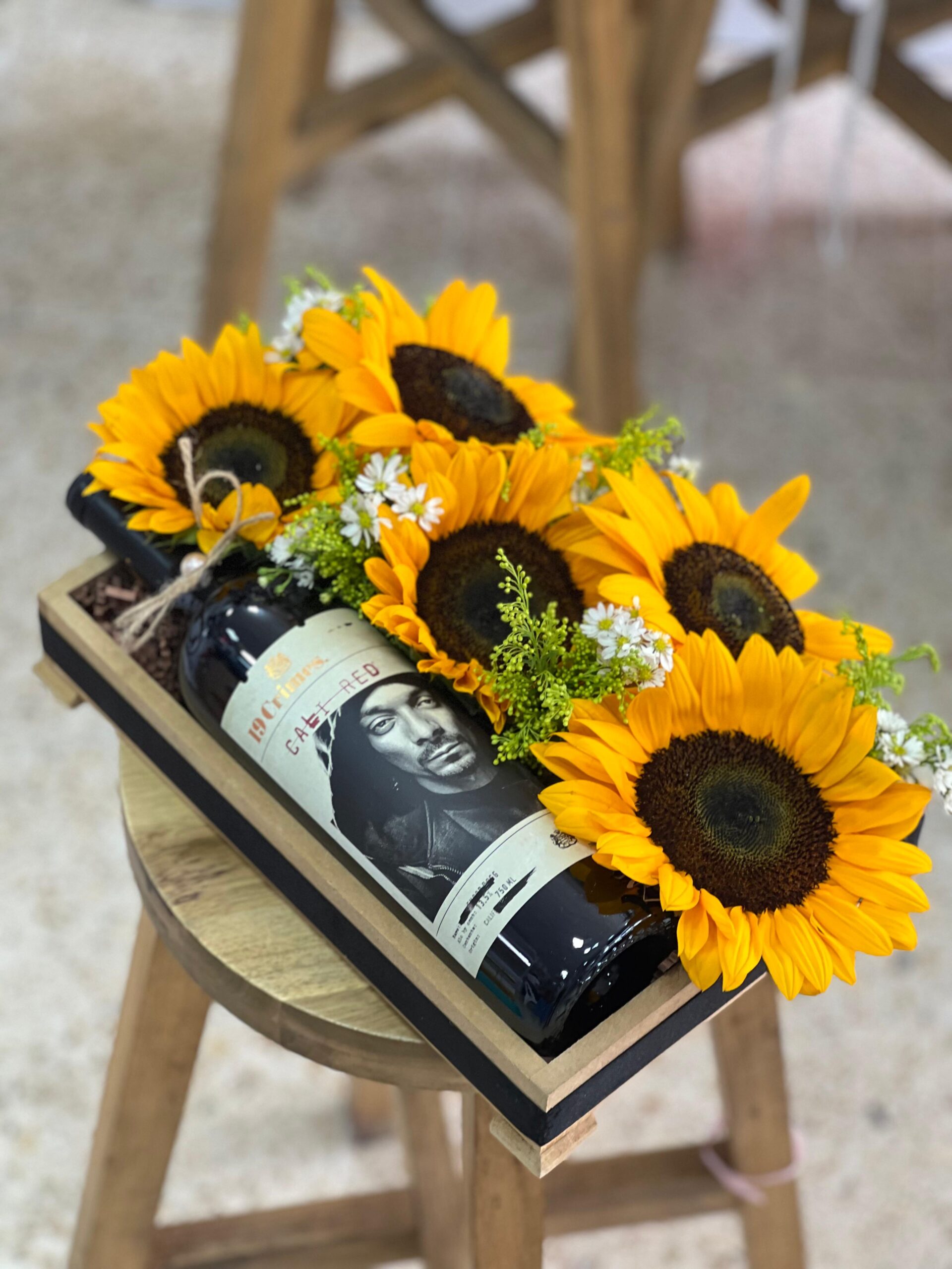 Imagina un regalo que despierta sonrisas y crea momentos inolvidables. Nuestro box combina la energía vibrante y la calidez de un majestuoso ramo de girasoles frescos, símbolo de alegría y luz, con la elegancia y el placer de un vino cuidadosamente seleccionado, ya sea un clásico que amas o uno que tú prefieras elegir para esa ocasión especial.