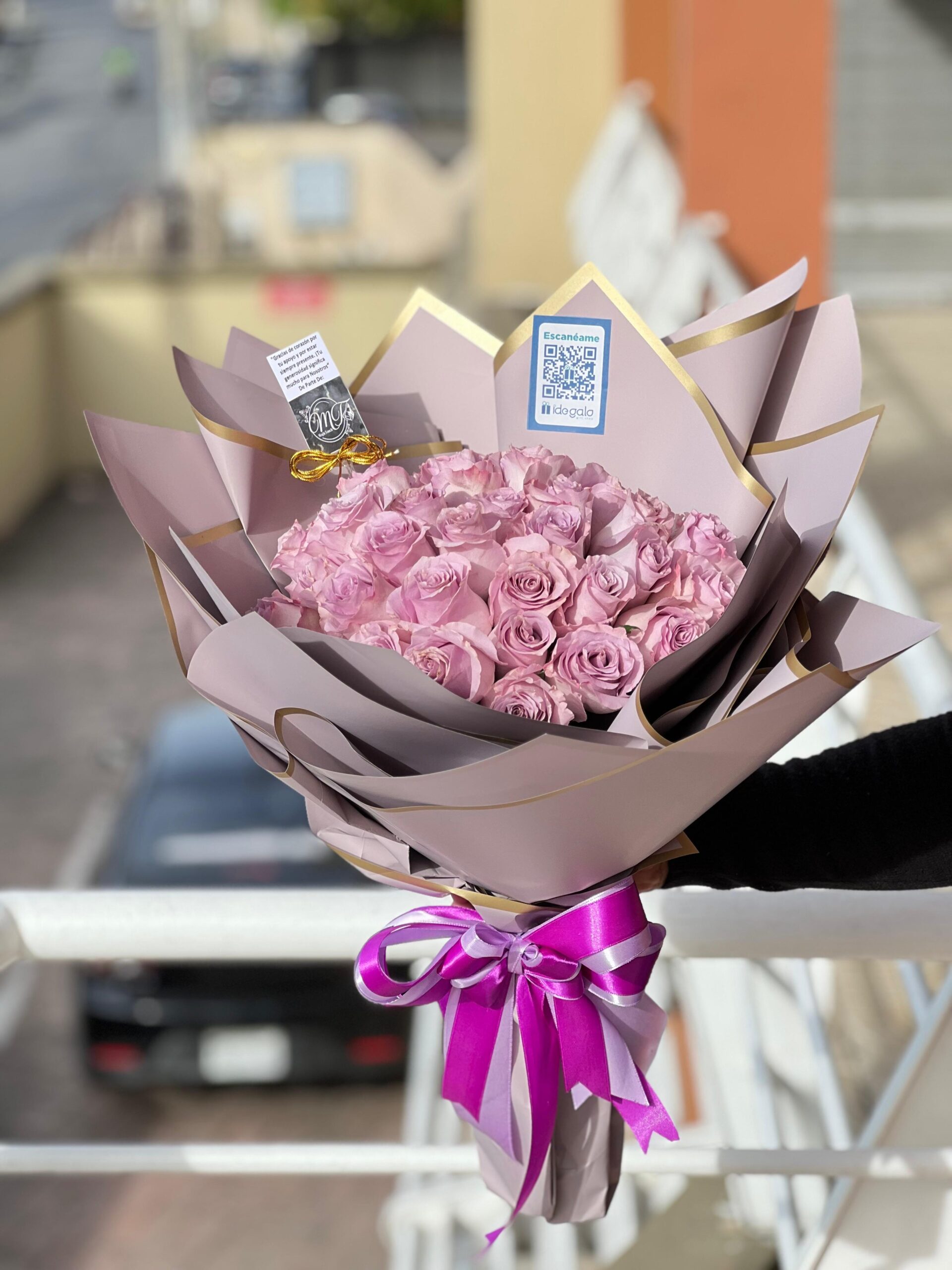 Sorprende con la elegancia y distinción de un exclusivo ramo de rosas ecuatorianas importadas, disponibles en tonos morado, lila o el color de tu preferencia. Cada rosa ha sido seleccionada cuidadosamente por su belleza y frescura, y el arreglo es preparado con esmero en papel coreano de alta calidad, realzado con un lazo elegante que le da el toque final perfecto.