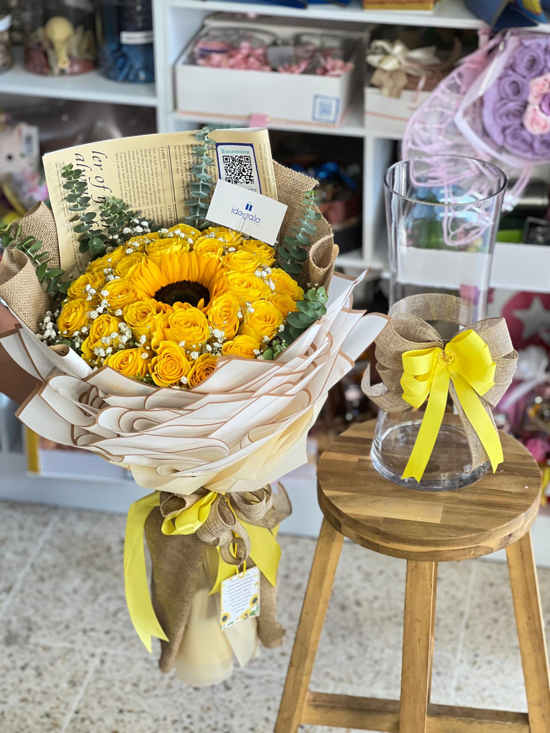 Descubre la alegría y calidez en cada pétalo con este exquisito ramo de rosas amarillas, coronado por un radiante girasol en el centro que ilumina y llena de energía cualquier espacio. Cada detalle ha sido cuidadosamente pensado: los frescos follajes que lo acompañan realzan su belleza natural, mientras que el delicado papel coreano en tonalidades variadas y el lazo artesanal envuelven esta obra de arte floral con elegancia y estilo.
